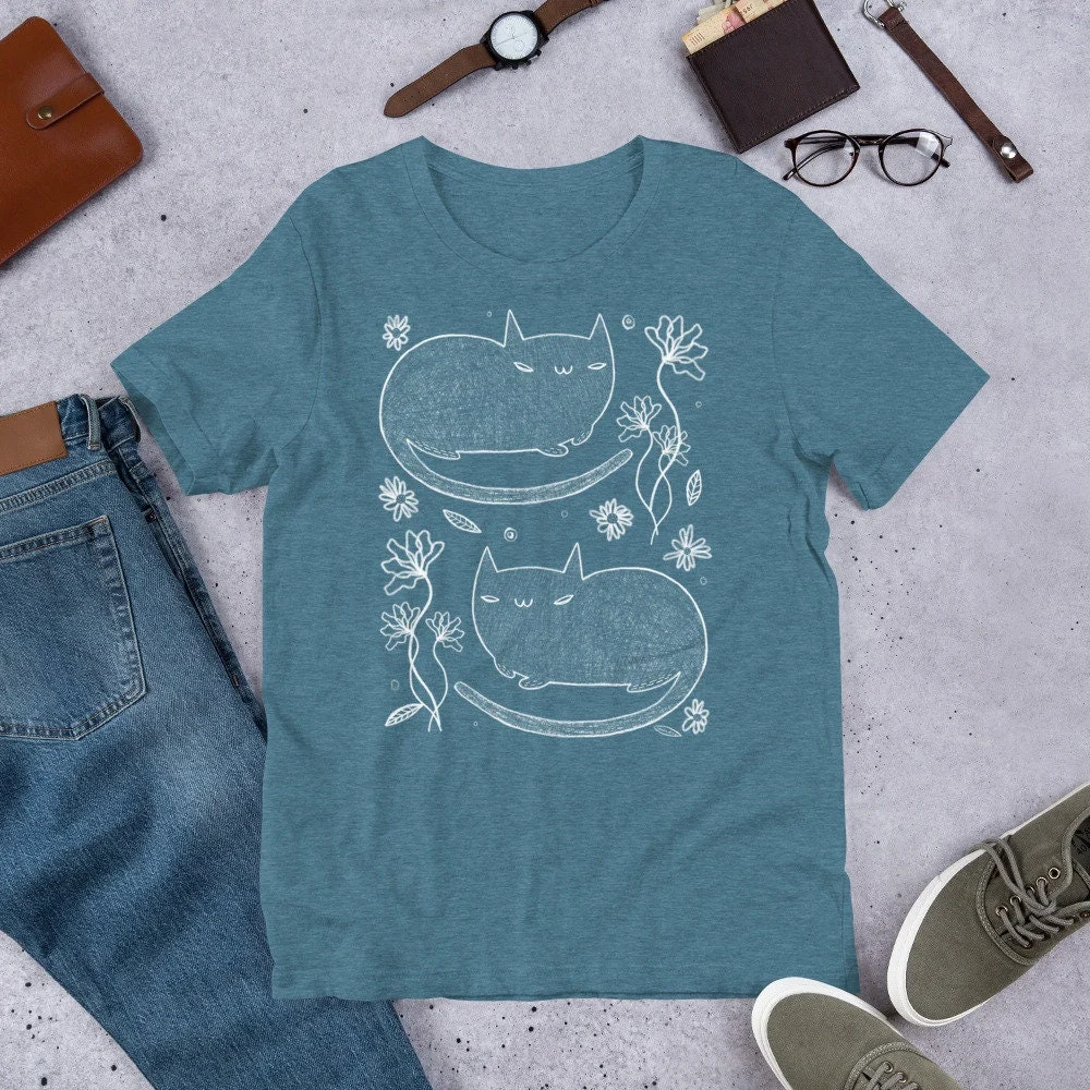 The two cats are positioned symmetrically, one above the other, nestled amongst delicate, soft lines of wildflowers or slender vines. Small white flowers grow all around, creating a mysterious, romantic, and very poetic natural scene.
