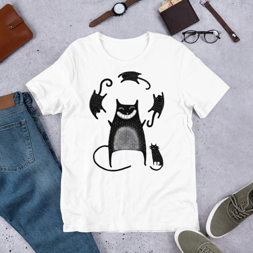 The central pattern depicts a large black cat, grinning widely (like a Cheshire cat) and performing a truly whimsical juggling act. Instead of juggling balls, this cat is juggling... smaller black cats! Three tiny cats are flying in a circle around the big cat's head, creating a humorous image.