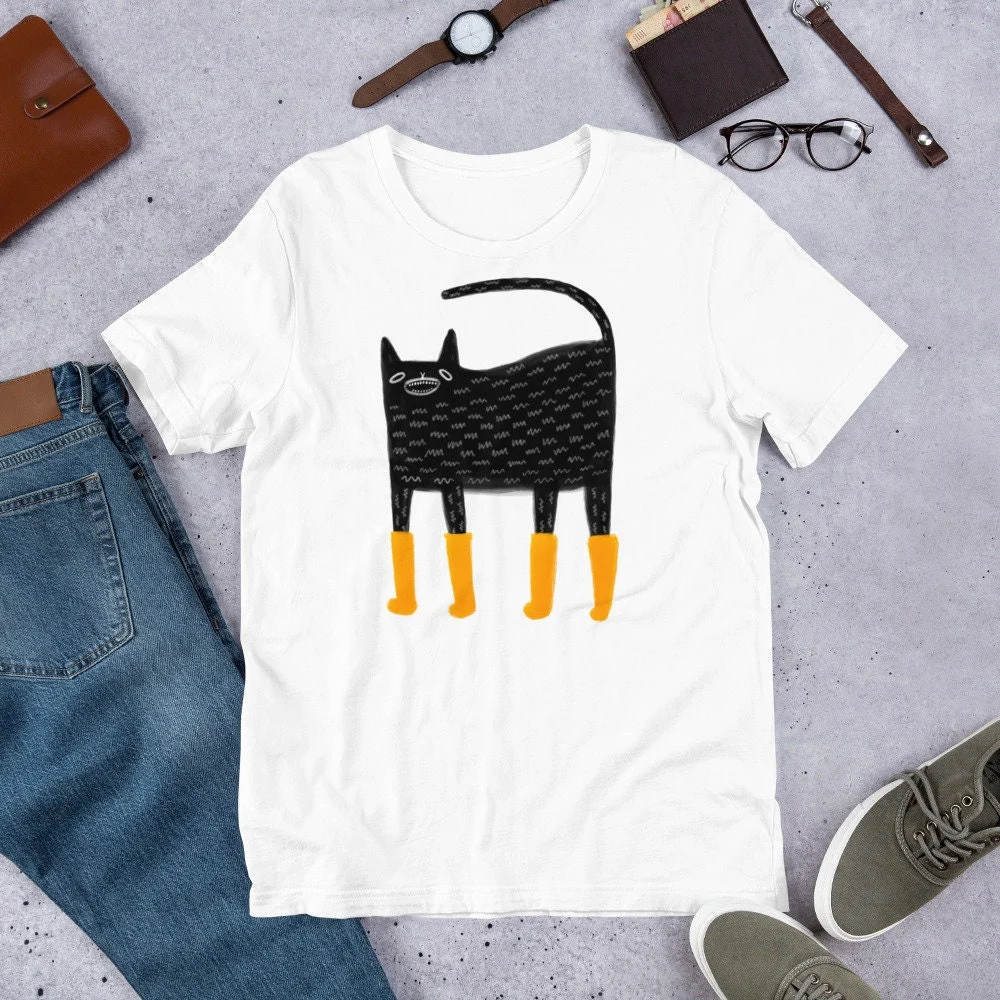 The image features a boxy black cat, drawn in a minimalist style using white sketch lines against the shirt background. The cat's body is decorated with small patterns, giving the impression of fur.