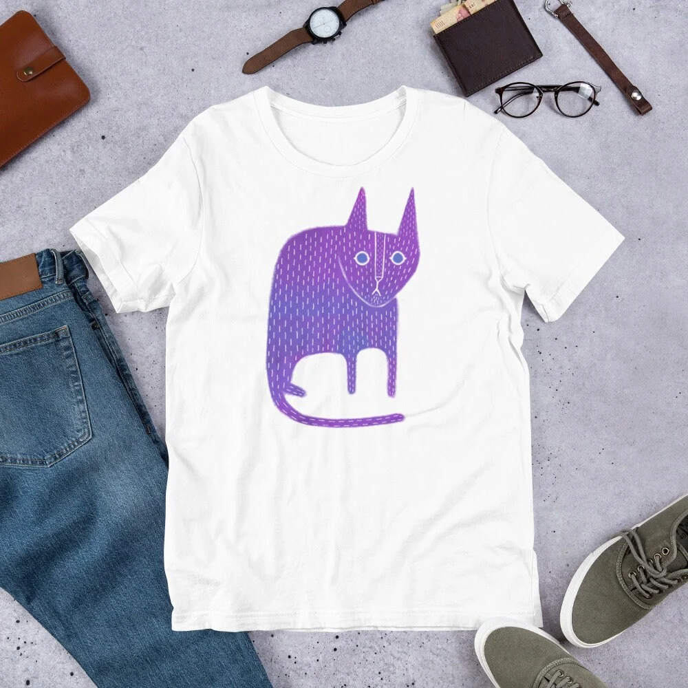 The central pattern features a simply-shaped cat, with a cylindrical body, four short legs, and pointy ears. The most striking feature is the cat's color. It utilizes a beautiful Gradient effect, transitioning from a deep purple to a lighter blue/purple (Vivid Purple/Blue), creating an ethereal and eye-catching appearance. The cat's surface is covered with small white or light purple dashes/dots, creating a unique texture, resembling a crayon drawing or an abstract weaving technique. The large, round eyes stand out, giving an innocent and captivating look.