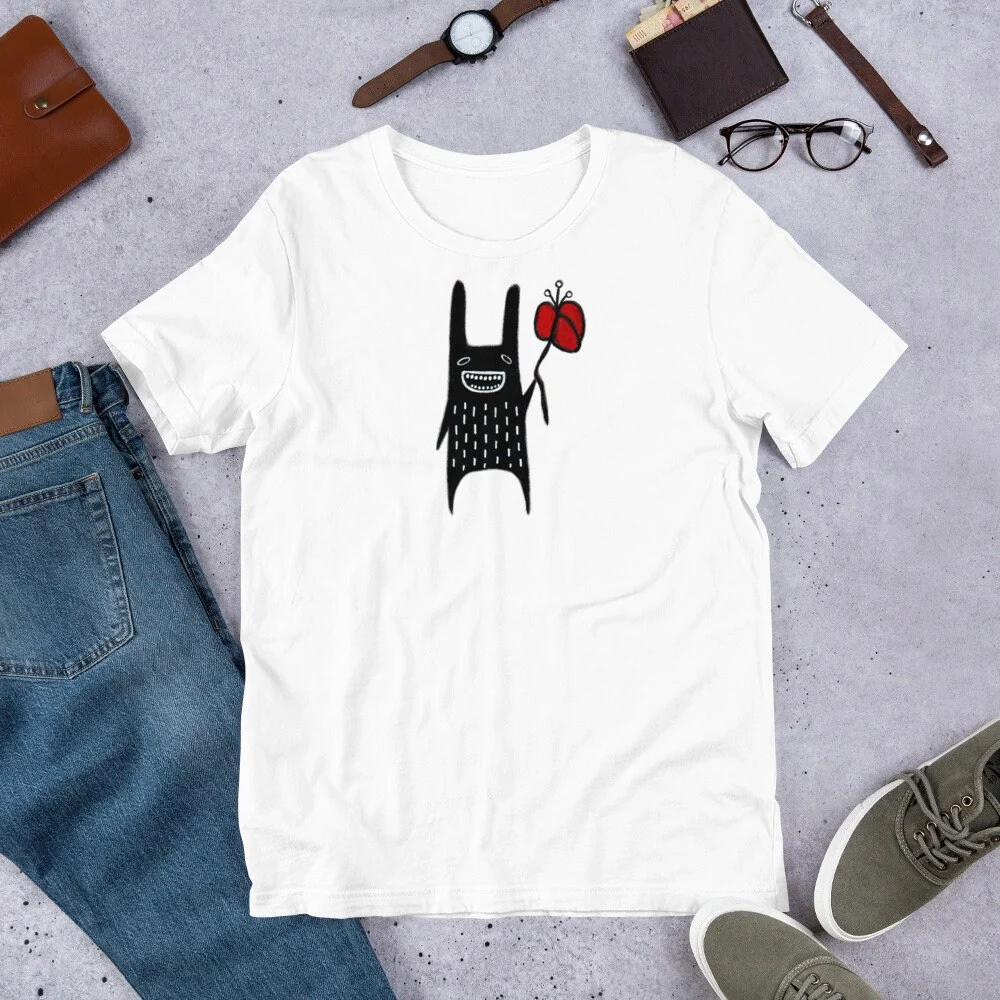 The image features an upright 'Rabbit Monster' character, drawn in a minimalist style with white/black lines against the shirt background. The character has long, pointed ears, a rectangular body decorated with white stripe lines, and notably, a wide grin revealing sharp, whimsical teeth.