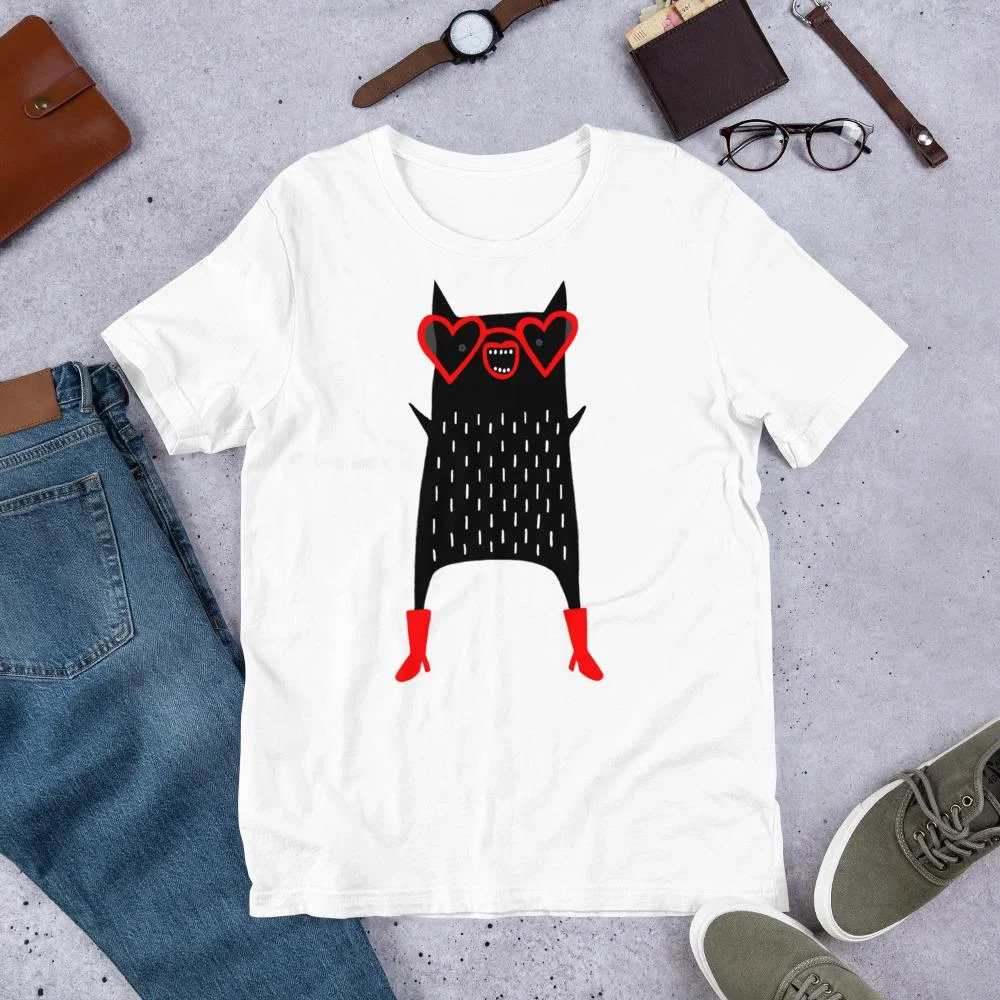 Heart Sunglasses: It is wearing extremely prominent and stylish red heart-shaped sunglasses, covering its eyes but exuding a mysterious, captivating vibe.