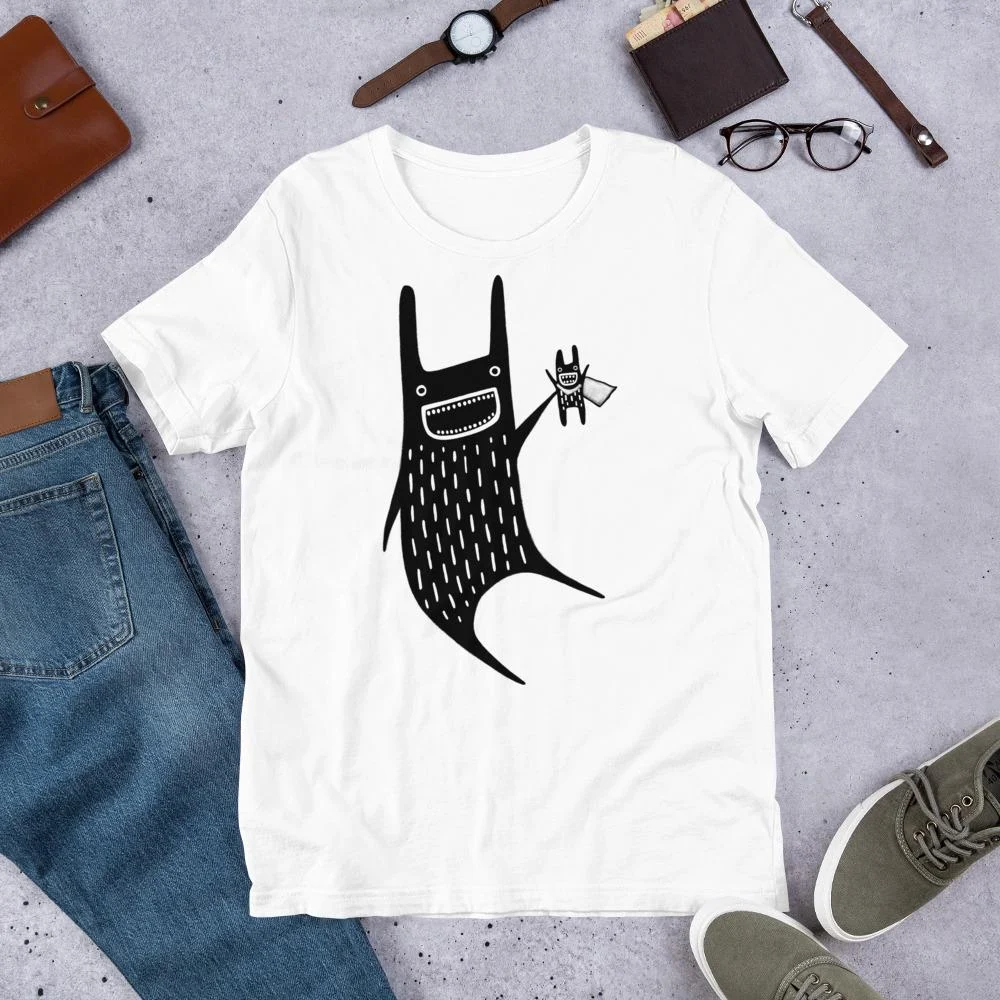 What's special is that this large character is holding a smaller version of itself (or a small friend) who is holding a camera up as if taking a selfie. This detail enhances the humor, fun, and 'self-love' aspect of the motif.