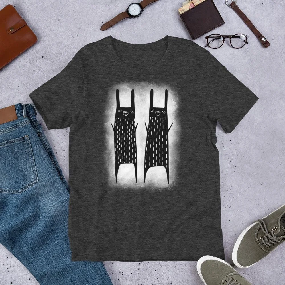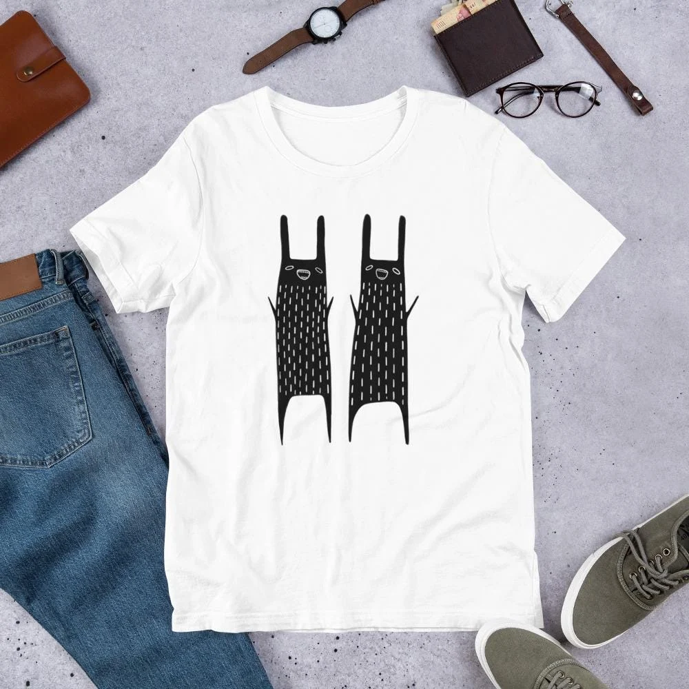 The symmetrical image features two tall, slender 'Rabbit Monsters' characters, drawn in a minimalist style. Both characters have an upright rectangular shape, with characteristic long ears (like rabbit ears). They have wide, toothy grins with even teeth, and their bodies are decorated with vertical white stripe lines, giving the impression of fur or suit patterns. The two characters stand side-by-side and raise their arms in a cheerful, innocent manner.