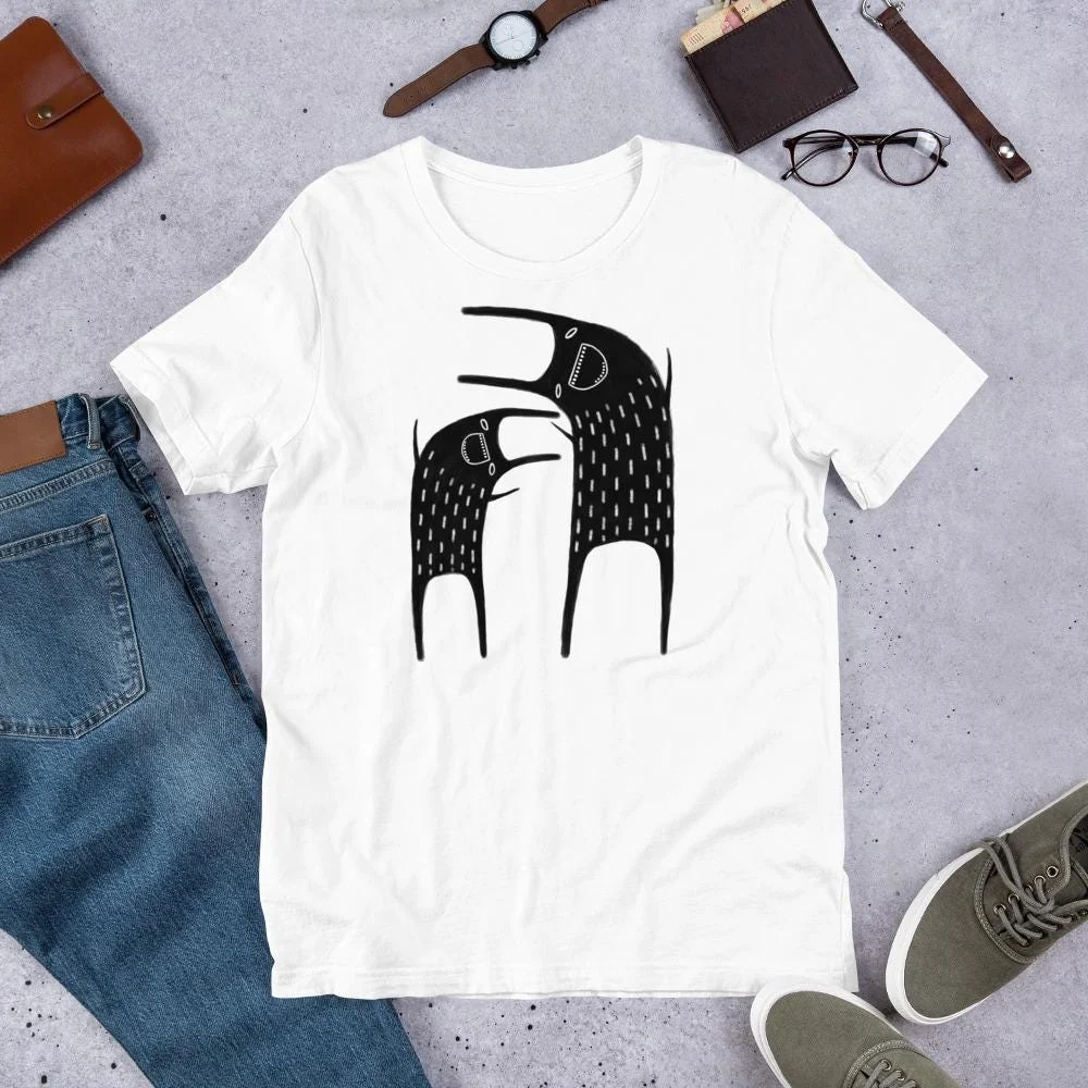 The central image features two 'Rabbit Monsters' characters, one large and one small, drawn in a minimalist style. Both characters have long ears and minimalist yet highly expressive faces with wide-open mouths, as if they are shouting, talking, or singing to each other. Their faces and wide-open mouths create a whimsical and dramatically fun look. Their bodies are decorated with simple white stripe lines.